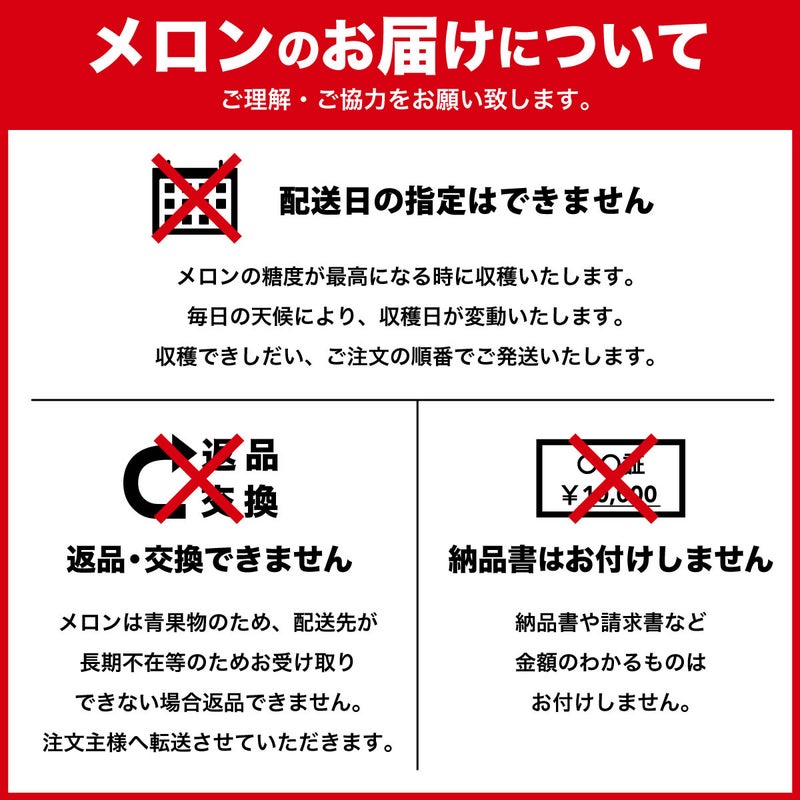 ※メロンはお届け日のご指定はできません。お届け先様が長期不在でお受け取りいただけない場合、ご注文主様へ転送させていただきます。