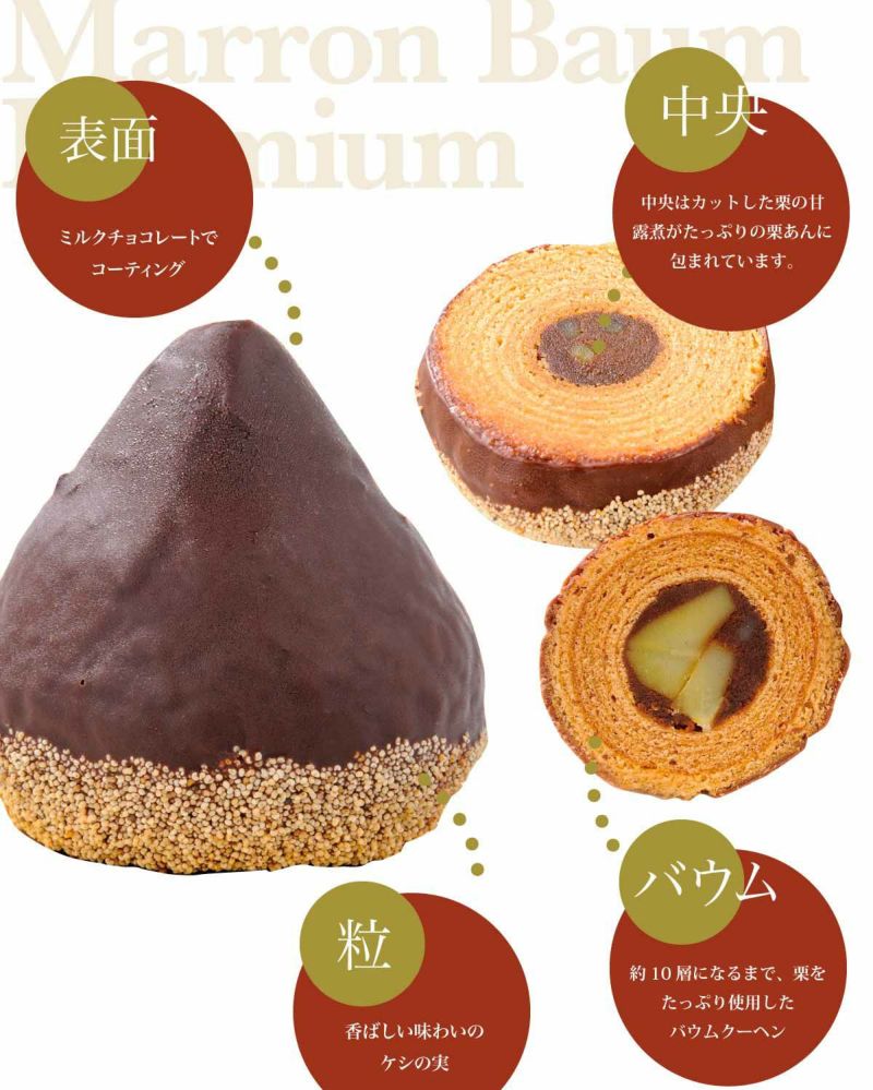 鶏卵(茨城県産)、栗甘露煮、上白糖、栗ピューレ、食用植物油脂、小麦粉、米粉澱粉、バター、白餡、タピオカ澱粉、水飴、酒、チョコレート、はちみつ、牛乳、寒天、膨張剤、香料